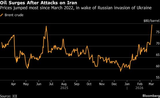 Brent futures were trading about 10% higher near $80 a barrel, while diesel futures — the engine of the global economy — jumped more than fifth. At least four vessels came under attack on Sunday, with a self-imposed pause in place by shipowners and traders as the conflict spreads.