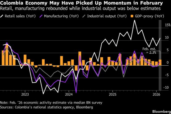 Colombian GDP-proxy data for February may show a modest rebound from January, though analysts have been marking down 2026 growth forecasts. The consensus looks for a 2.6% expansion, in line with last year.