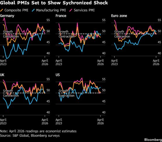 The initial take for April in economies from Australia to the US will be published on Thursday. Among those covered by Bloomberg forecasts, indexes in Germany, France, the euro zone and the UK are all anticipated to show broad deterioration, while the American indicators are seen little changed.